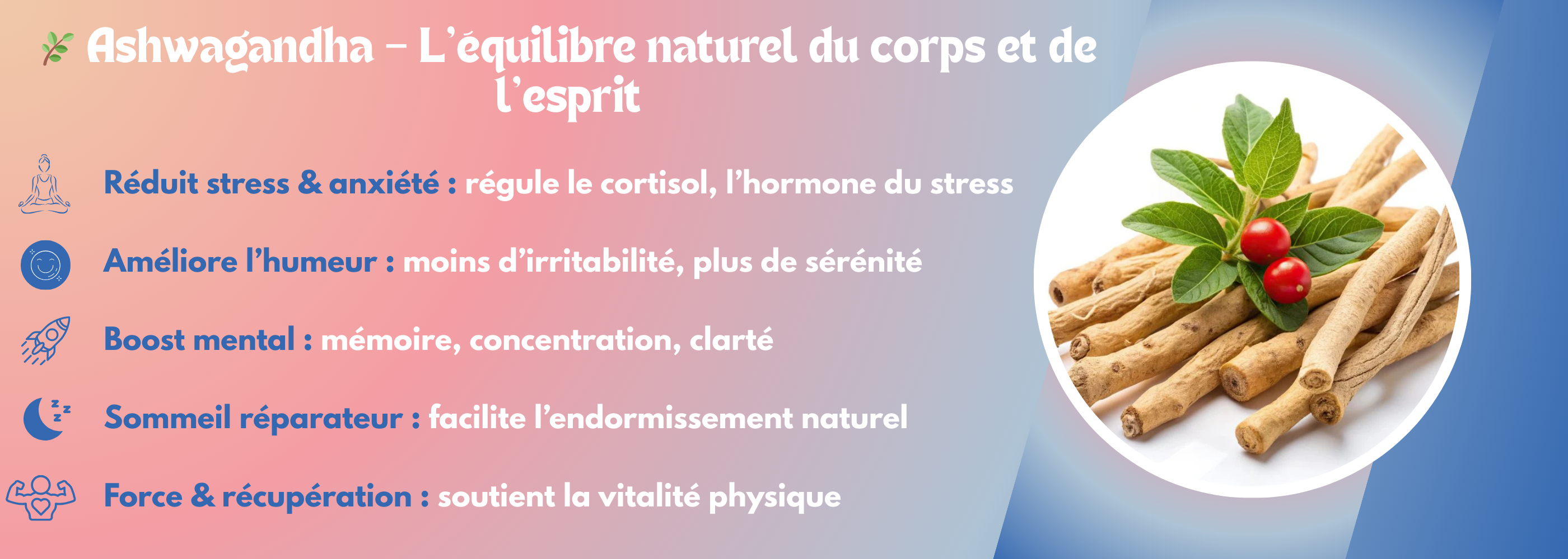 💥 Plante adaptogène puissante qui aide à réduire le stress et régule naturellement le taux de cortisol.