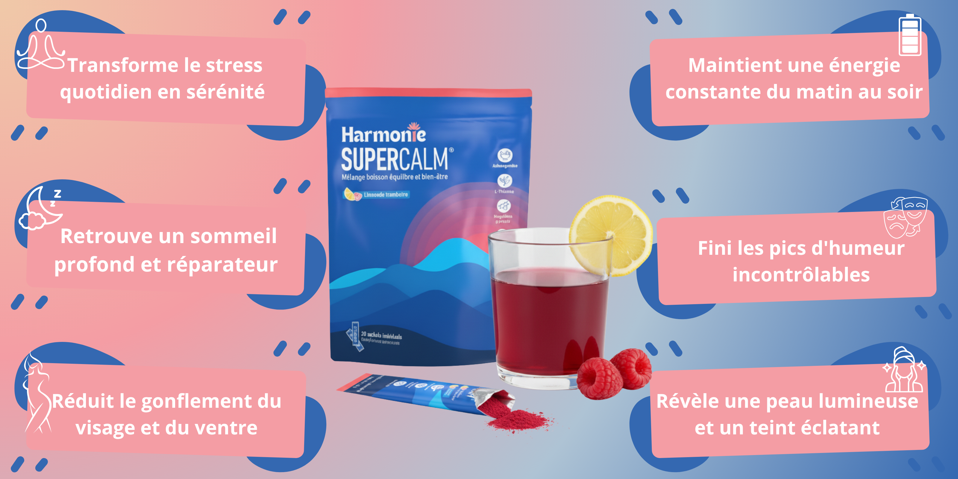 Harmonie SUPER CALME est une boisson bien-être conçue pour apaiser rapidement le stress, améliorer le sommeil et soutenir un glow naturel — sans sucre, ni somnolence.